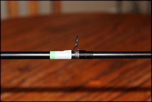 I used the lime green and black NCP for the base. It did turn out dark though for some reason. Maybe I should have laid the top layer in green. I am planning on getting a dowel rod and doing a few in different colors and to get some practice down on it. Here are a few more pics from the start up though of the guide wraps. I know the wraps look long for the guides, but I went with a smaller guide than the originals and I straightened up any of the gaps before I finished them. And the blank was scuffed where I removed the old epoxy. But the rod turned out balanced directly under the reel, opposed to 2-3" in front of the reel seat like it used to be.