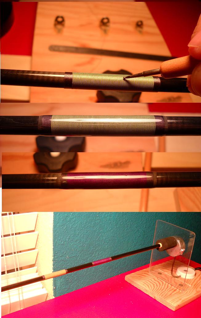 ...I like it,but I dont know yet.The pics show the progression of doing the overwrap...I started with purple which is my main color (size A)....Then added the orange thread which will be my sacrifical thread (the thread we will remove) The orange is size D..I wanted a wider spacing inbetween the purple to let more green show through from below.I also took picutures of my regular burnishing tool to pack the thread(which is just a circuit tester that I hit with steelwool),and then again of my tiger burnishing tool that I do next. Once I unwind the sacrifical thread off (my favorite part )..I do a coat of color preserver (not pictured) let that dry,then a coat of thread finsih to even further the moire effect of the tiger.The pictures add more lines than there really is...But it looks really sweet in person. Im also working on a new grip inlay with lime green foam to match the green thread....So far,so good...I was scared it wouldnt sand smooth,but so far its great! Im think Im done testing???...I hate it when I cant edit stuff