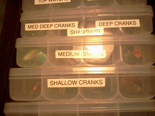 I have boxes for crankbait that dive less than 10', more than 10', squarebills, and deep divers such as DD22s. I have a few boxes for each catagory and divide my crankbaits by color in those boxes. I also have a few crankbaits that I been my favorites on my local lakes and I have boxes that are full of those crankbaits, for example I have a box of Bomber 7A crankbaits in Firetiger, another box of Bomber 7A crankbaits in Apple Red Crawdad and Dark Green Crawdad, and another box of Strike King crankbaits in Sexy Shad color. It's a lot of different boxes but it makes it easy to only take what I need in the boat and not have to take a bunch of boxes with me when I know I will only need one or two different crankbaits.