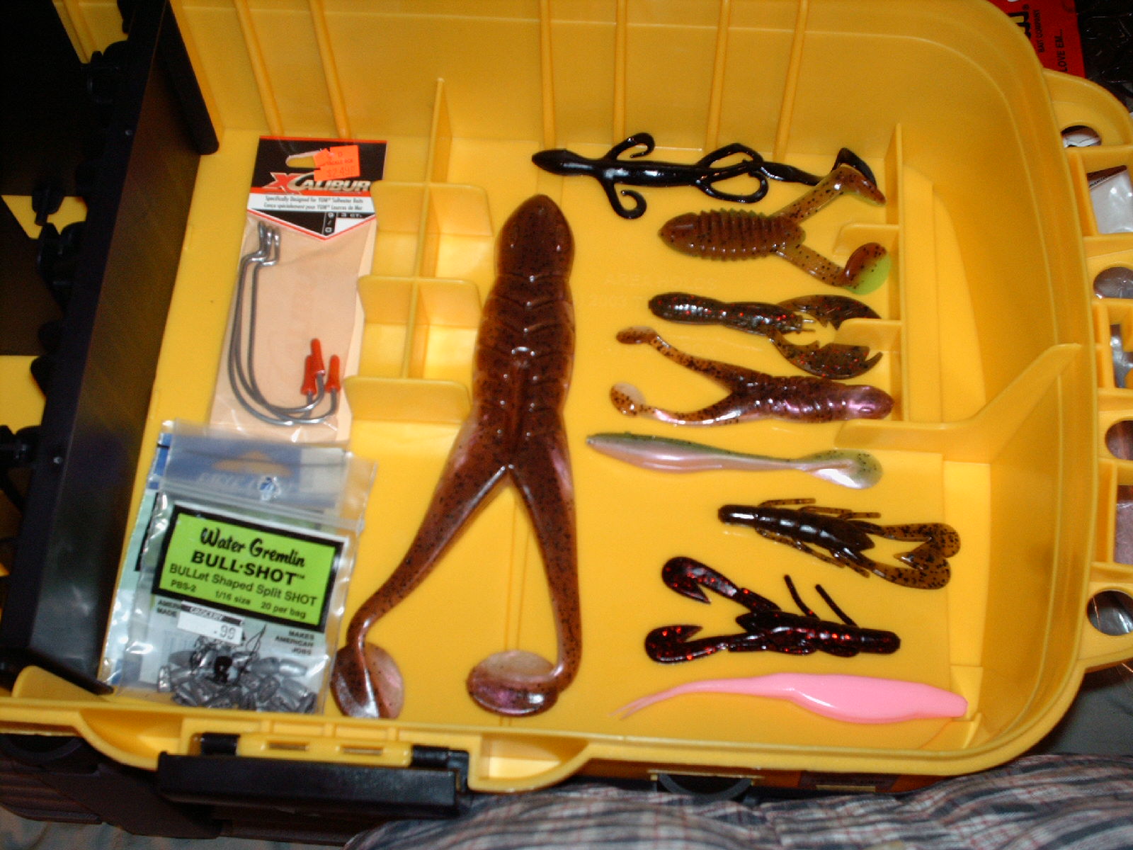![]() From Left to Right 9/0 Hooks, below that 1/32 and 1/16 oz bullshot Magnum Toad! The mystery lure! Its 8" and made my Seizmic (their 4" has been my favorite toad ever since I tied one on over a year ago so I had to pick up these monsters). Zoom Lizard Gamblers Cane Toad Baby Paca Craw Seizmic Toad 4" Producto Buzz Tail Shad Zoom Ultravibe Craw x 2 Zoom Super Fluke in bubblegum Backdrop is my new tackle box This is a good time of year not only for topwaters but also big bass and also big baits. Hope to catch some hawgs with those magnum toads, will be a good night time lure in the heat of the summer as well.