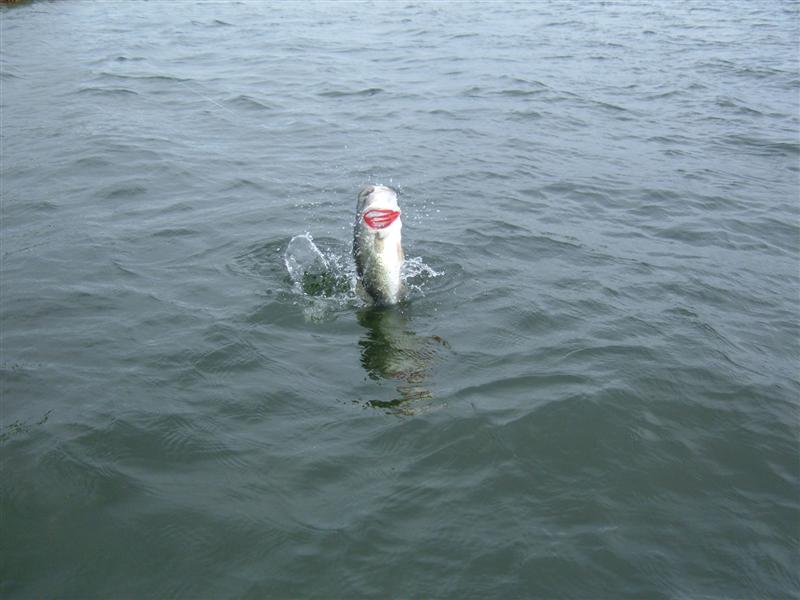Went out saturday in 15-20 knot winds with my son Ben. The little trolling motor could hardly keep the boat moving forward, but the bass were hungry. Got about 30 on all types of artificials; swim baits, crank baits, jerk baits, rattle-traps, buzz baits, and a couple on spinnerbaits. We had fun trying to get pics of them jumping. Here are a few: