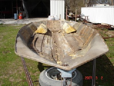 Talk about gettin a woody LOL Man I wished I had a garage big enough to do my project like that. My garage is to small to spread out my work so to speak. What model is that one Ally. So did ya have fun when seperating the cap from the hull back at the splash well where for some reason they just poured in a mixture of milled fibers and resin right at the top. LOL I cussed more right there than I did when I was removing the floor and stringers. Hey if your gonna put some serious hp on her I have the pics of one that was done up with the addition of some knee braces which allowed the boat to actually handle 425+hp and never crack or even groan a little. Lemme know ifn ya wanna see them. Mine is the 1550 Magnum. Any info that you need or want gimme a holler. I have tons of info including the history of the Lasers right from the begininning on. Tell ya something else I have located one of the ORIGINAL molds.........thats right one of the original Smmerford molds for the Lasers. Trying like hell to get my hands on it to build one from the beginning. I just about got the guy talked into selling the mold.