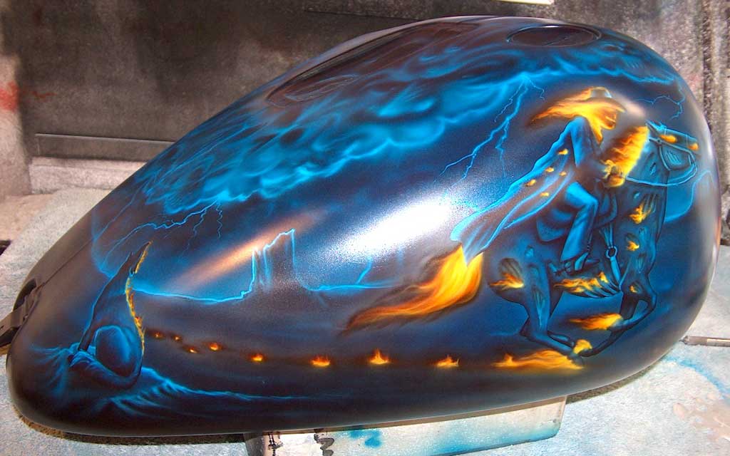 I do take commision work, but because I'm disabled I don't work as fast as a normal guy runnin a full blown business, so my turnaround times are slower than those guys....if you can deal with that i'm happy to airbrush for most folks....but that also depends on what they want....theres alot of stuff i'm not interested in painting.....tee shirts, ball caps, license tags, just to name a few....nowadays I tend to work for the biker community for the most part....but I still do stuff for the occasional hotrodder or racer....even done a few wall murals for a local restaurant, but i'm not too keen on ever doing that again....lol Thanks for everyones kind words about my art....I always enjoy hearing what others think. |