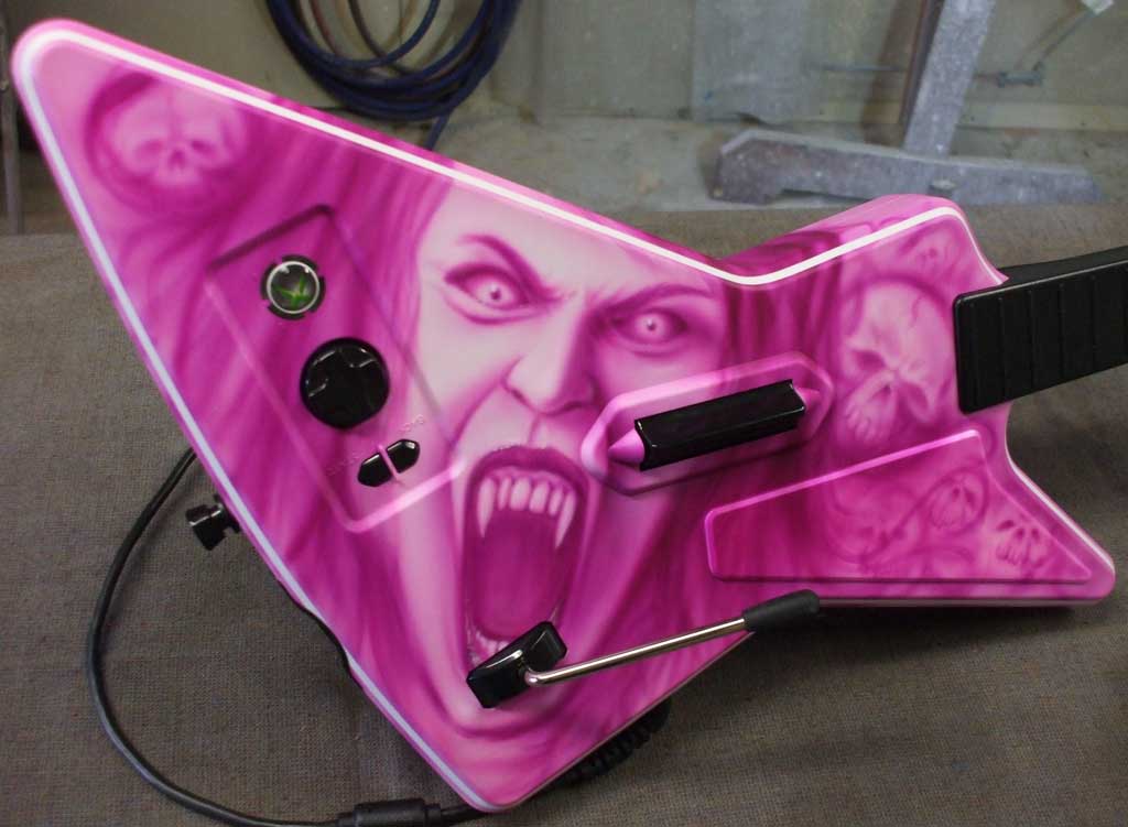 When i'm not fishin, I enjoy art.....I love using the airbrush, and I've been airbrushing off an on for over 30 years. Heres a sample of items I've painted recently. A couple were even bass related....the tire cover was a gift for my neighbor and the panel was for myself. I'm finishing up a Ghostrider themed Harley for a local guy that i'll share tank pictures of before they got clear coated. I also like computer sim racing games and we got an Xbox360 this Christmas so we play that alot too(hence the guitar hero controller my daughter insisted I paint for her....lol).