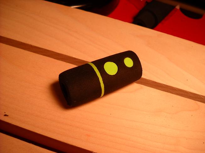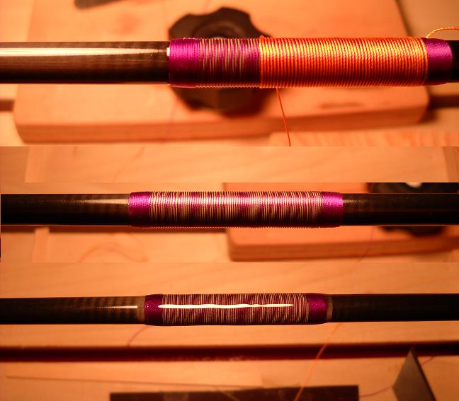 ...I like it,but I dont know yet.The pics show the progression of doing the overwrap...I started with purple which is my main color (size A)....Then added the orange thread which will be my sacrifical thread (the thread we will remove) The orange is size D..I wanted a wider spacing inbetween the purple to let more green show through from below.I also took picutures of my regular burnishing tool to pack the thread(which is just a circuit tester that I hit with steelwool),and then again of my tiger burnishing tool that I do next. Once I unwind the sacrifical thread off (my favorite part )..I do a coat of color preserver (not pictured) let that dry,then a coat of thread finsih to even further the moire effect of the tiger.The pictures add more lines than there really is...But it looks really sweet in person. Im also working on a new grip inlay with lime green foam to match the green thread....So far,so good...I was scared it wouldnt sand smooth,but so far its great! Im think Im done testing???...I hate it when I cant edit stuff