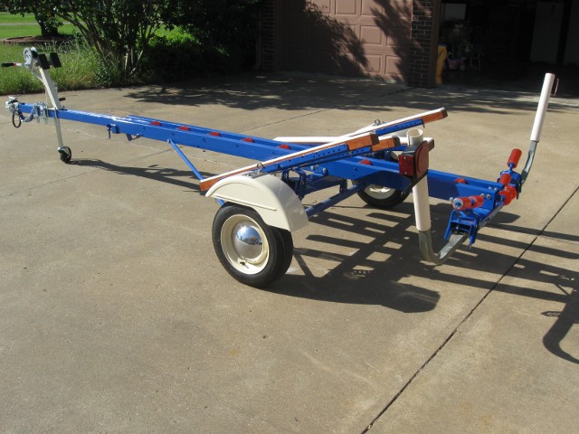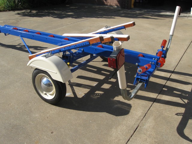 First of all I had it sand blasted, primed and powder coated to original colors. It had 4 trays of bunk rollers which I replaced with Cypress wood. I used 2 full 2" X 4" pieces on each side and also installed bunk slick material on top of that. It's worked real well so far and I'm not worried about rot at all. Oh yeah, I also put 3 coats of deck stain/sealer on the wood too. I figure I ought to get another 55 years of use out of it. Good Luck with yours and give us an update!!! Mike |