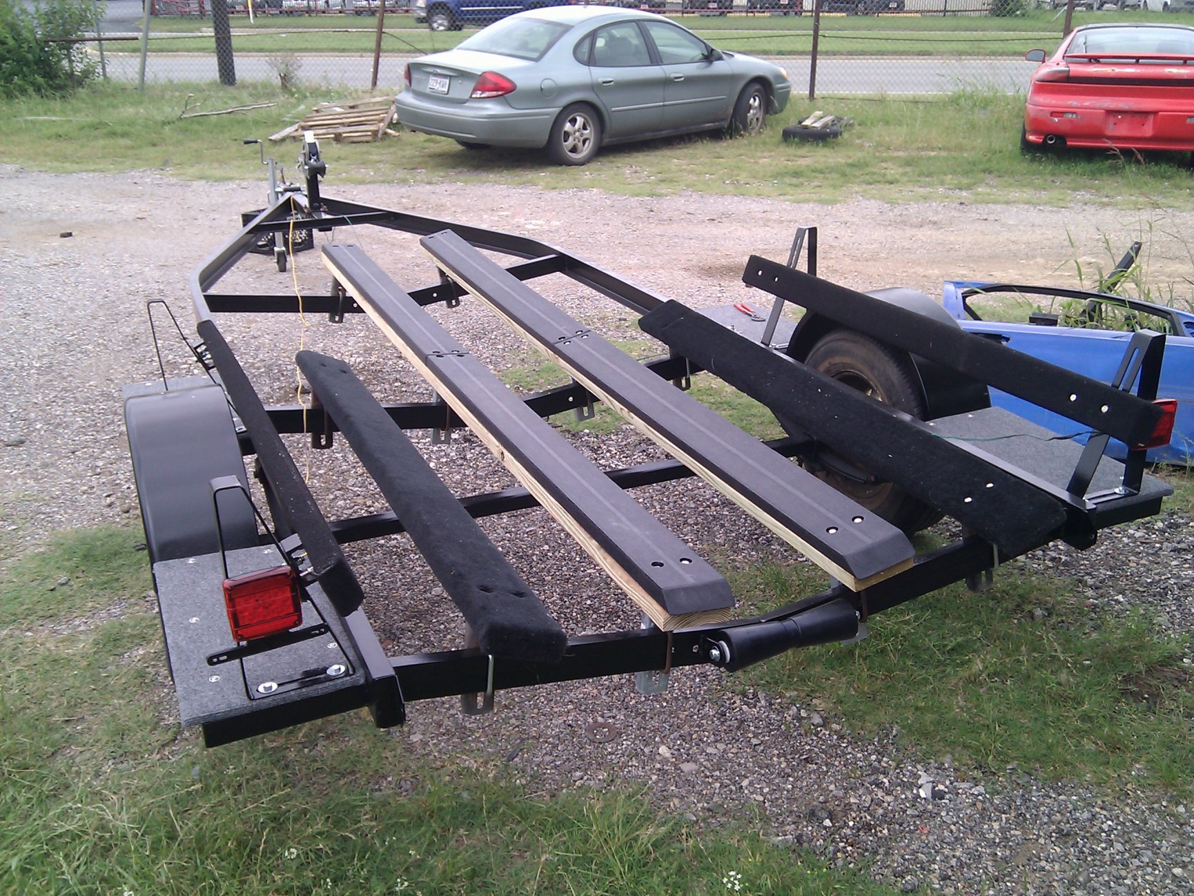 I think it was about three weeks ago I finished my trailer. Had a blast doing it, and learned a lot. Wish I'd had the chance to sand blast and powder coat my trailer. I bet it holds up a LOT better than paint. I wire brushed mine down to bare metal, primed it, replaced the hubs and bearings, replaced the fenders, fixed a couple of welds here and there, re-primed it again. Dad helped me get started in painting it. Put on 4 coats of paint and then topped it off with a glossy Krylon. Over kill, maybe. But I want this to last a while. I also put 2 coats of rubberized undercoating under the new fenders and on the leaf springs. I replaced the wooden side steps with 1/2" plastic HDPE cutting board material. Bought a 4' x 2' piece and cut it down to size. Carpeted those in gray, used Monel staples, installed with stainless hardware. Replaced all the (nylon locking) nuts, bolts and washers with stainless for that matter. Thought I would try some of those Ultimate Bunk Boards after hearing all the rave reviews about them. Cut them down to size, angled and smoothed out all the edges so as not to catch any rivets. Set them on the bunk brackets (not bolted on yet) and with in 2 days, they had warped 2 inches just sitting there. That just wasn't going to work. Before I heard back from the guy at UBB, I went and bought a couple of treated 2x6x12's and put them under the UBB's for support. Not a fan of those Ultimate Bunk Boards. Time to switch the trailers. Blocked up the stern of the boat with jack stands and 2x6's for support. Put a tow strap under the bow and had a fork lift raise it up. Pulled out the old trailer and tried to slide the new one in. New trailer sits a lot higher than the old one, so we ended up having to winch the new trailer under the boat. All in all, it worked out all right. Readjusted all the bunks for a superb fit and it was almost ready for travel. Couldn't figure out how to hang the wires for the lights so I ended up using some self adhesive wire hangers. So far, they work very well. Made one last run through and checked all fasteners,locked down the boat and went fishing that day. ![]() I'll have to get a picture of the finished rig in it's entirety. Post it up as soon as I can. |