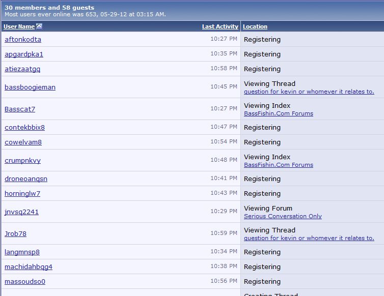 As far as the spammers, I think we're just going to have to get used to seeing their names at the bottom, unless Kevin completely changes the way the registration is set up. They aren't getting through and posting, that's the main thing.