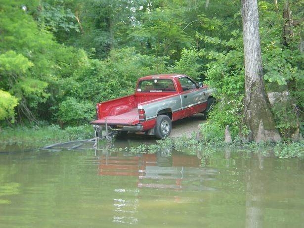 This day, they had decided to lower the water 1-2 feet, thus making the shallow lake difficult to navigate and making most of the cover I would be targeting high and dry. I still managed several bass however, and lost a few larger ones, all throwing a white bagley spinnerbait with white willow/colorado blades. Water temp at one point heated up to 90 degrees per the depth finder, but that transducer is black so that might have been a slight exageration. It was still hot. Water was clearer for this lake. I took the boat out of the water to go to nearby Camden around lunch, and when I had returned it looked like they had lowered the water another 6 inches, so I decided to make the trip to an oxbow I've been meaning to hit for 5 years. Managed a couple small bass on the white fluke at this lake, which I thought was pretty good considering it was silted in and only 3 feet deep at its deepest. A gator sunning itself on a new beach, created by the receding waters. A small bass caught out of Perry lake, an oxbow of the cahaba river. Another bass caught at Millers Ferry on the spinnerbait. The ones with size got away, but this fish thought it was a keeper. Lucky for it I did not concur. The starter has broken the mount on the outboard. After much thought at the office (or on the jon), I decided to wrap a band clamp around the entire motor to hold the starter in place. Its worked for 2 trips now. Brother Zooker recomended trying JB weld to reattach the ears which hold the starter in place, and that is setting as we speak - but I will keep the band clamp for additional strength. I can't believe I got the boat launched into this place. The ramp was about the size of the pickup bed and I had almost no room to manuver the truck. PS, yes thats my new truck.