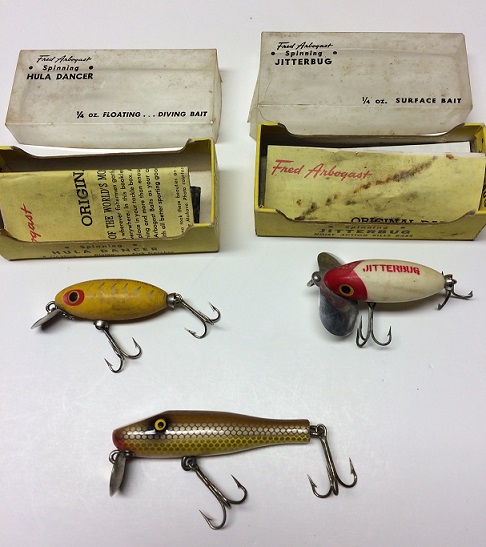 Selling these Vintage lures. All three sell about $20.00 to $30.00. I’m asking $55.00 for all three lures. They are River Runt by Genuine Heddon. Fred A. Arbogast Jitterbug 630R.Fred A. Arbogast Hula dancer. Two of the lures come with a box and paper work. The picture is attached.