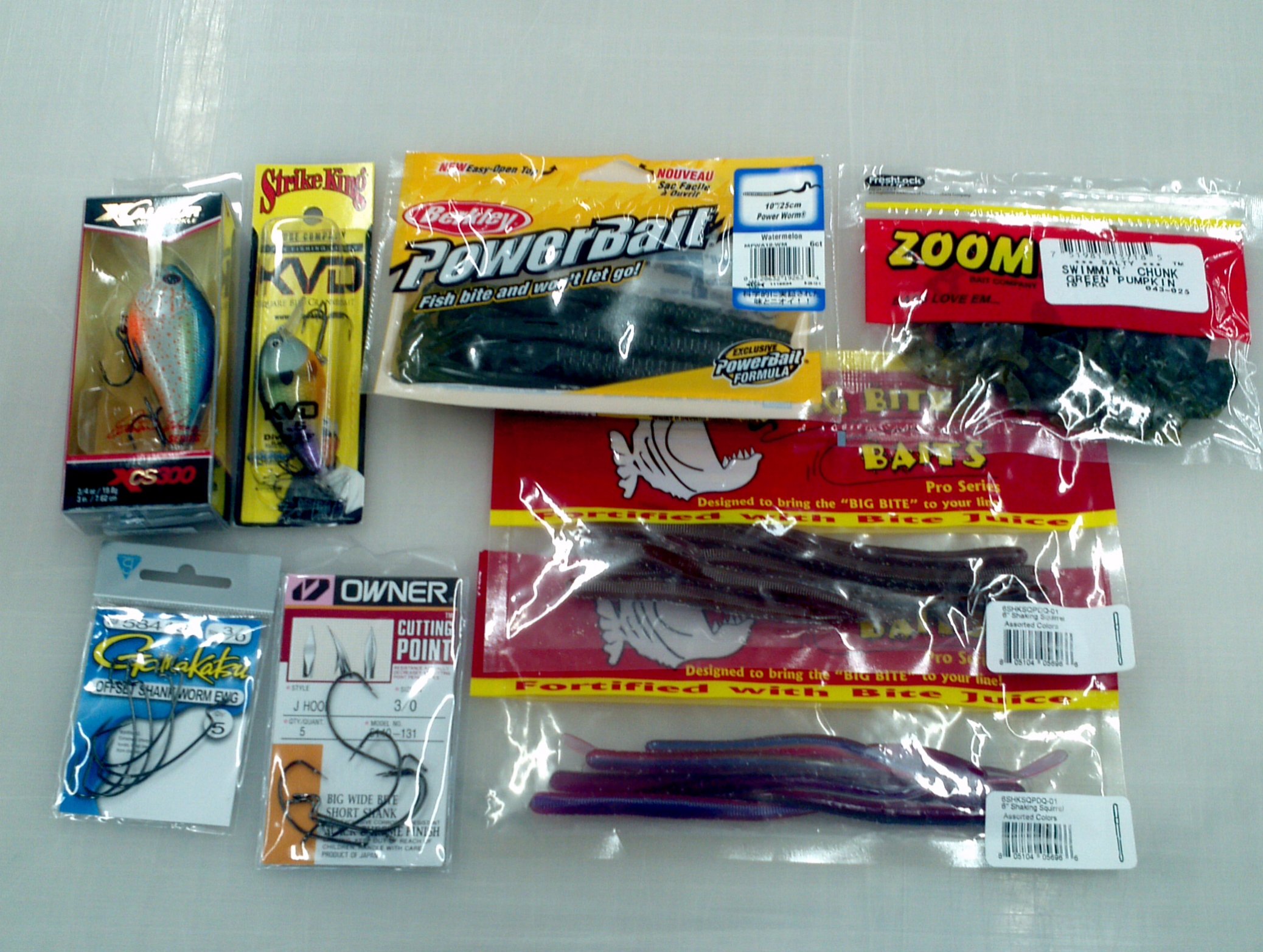 I couldn't be happier with the stuff I got. It's all stuff I like and use. I got an XCalibur XCS 300 and KVD 1.5. Those are by the far the 2 square bills I use the most, they are in great colors too. I also got some plastics I've been waiting for my Academy to get in stock, the Big Bite Baits Jeff Kreit Shaking Squirrel worms. Roboworms are by far my favorite finesse worms and these are the closest to Robo's I've seen. I've been wanting to try them since I first heard about them. I also got some Zoom Swimming Chunks and Berkley 10" Power Worms, both great baits. Lastly, I got some 3/0 Gammy EWG's and some 3/0 Owner J-Hooks with the cutting points.