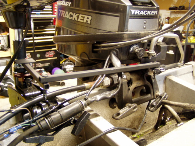i guess i was really bored today since i couldnt go fishing so this is what i did. i have a 17ft tracker w/ a 9.9. the boat has power trim controls from the bow and the throttle linkage. i tapped into the bow power trim wires that run from bow to stern hooked it up to an on/off toggle switch(the switch on the left in pic)......at the transom in the battery compartment i hooked up a solenoid. i took the tramson motor alligator clips neg to battery and pos to solenoid.i now have a constant on/off from the bow or a momentary from throttle linkage. but wait there's more.....then i wanted to use the sterring wheel to steer the transom motor so i rigged up a control set-up. i now can stand in front and use either tm or both.......i also can sit in drivers seat and use transom motor and steer it. i also made it removable w/ a clevis pin when i want to use gas engine otto |