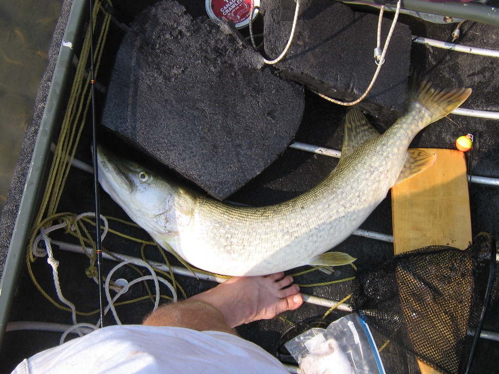 Grandpa needed to stretch his legs so we beached the canoe and sat on the shore eating some PBJ sandwiches when across the pond (about 120yds) I spot something odd. Something that appears bleach white bobs to the surface in a shallow area and makes a feeble couple of splashes and then floats. We watched it for about 5 minutes it made a few weak splashes, bobbed and then just floated. we really had nfew guesses what it was. Maybe a flipped over turtle, or my dad thought dying seagull... We hopped into the canoe and hustled across the pond... take a look at what had, we think, just died in the pond. The weird think is this is a land locked pond. There is, however, a river not to far away 1/2 a mile that probably reaches the pond on the rare years that it floods. Anyway, that is my size 11 foot in the picture. We measured it at 36 1/2 inches and once Jr saw it's teeth he was ready to quit fishing. I've never seen a pike in that water, nor heard of anyone catching one.. What do you guys think? Ever heard of pike in a pond? If you click on the picture it get larger and you get a better look... Excuse my ignorance, but it is a pike right? Oh Yeah, I know I got ugly feet!