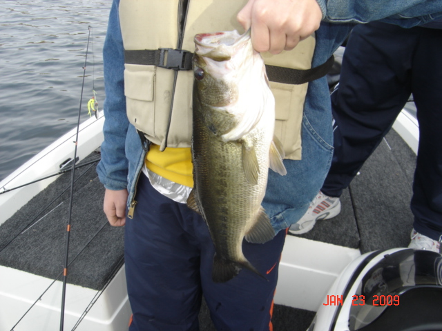 Well the weather was warm today so jasbo33 and and his son and I decided to go try are luck today. I caught a trout and jasbo's son caught a 19 1/2" bass. Had a ball help the cabin fever. You can not hardly tell the size of the bass in the picture but it is a nice one.