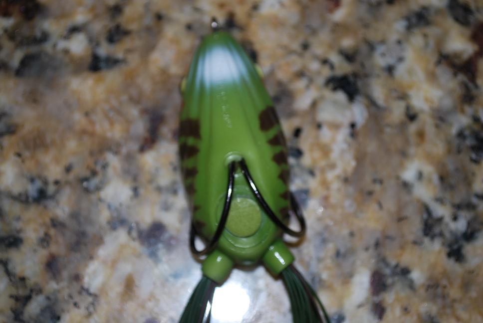 The hooks are really sharp, and you can run your fingers over them until the body is smooshed with the least amount of pressure possible. Then the hook is half way into your finger ![]() I like the idea of the drain hole, but I haven't fished the frog yet (just got it in the mail 5 min ago and it's raining) so we shall see about how well that works. The rattle inside is a nice touch, but not very loud. In conclusion, I'm very pleased with my purchase, but I can't give a complete review until it sees some action. Basically its a Spro frog with a few upgrades. |