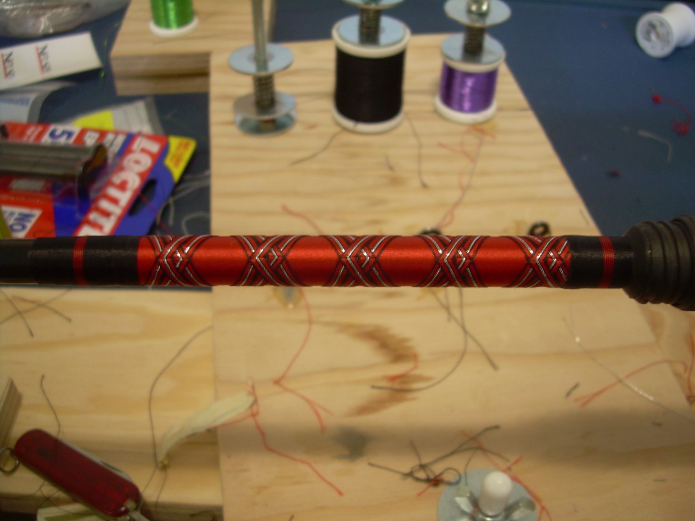 Ok tell me what you think about the MHX blanks?...On the forums,when Loomis arent available people are steered towards MHX because Im told they compare to the GLX Loomis.Im ordering one at the end of the month...Im really wanna try one out. I like Rainshadow alot,great sensitivity!! and light weight.I used two CRB blanks,and I wont use them again...Thier not bad for a IM6 and the price,but Forcast&Rainshadow blows them away!! The CRB blanks are kinda heavy and not much sensitivity. You know the thought the foam brushes crossed my mind,I might have to give something like that a try...What are they called? How hard are those microguides to wrap?...Those things are tiny,lol As far as the decrotive butt wraps go...Once you see the fundamentals,there all easy,lol..Belive it or not the hardest part is the trim band in my opinion.... Open wraps like the chevrons,reverse chevron (above) ,optical chevron,and diamond wraps are all done almost the same....Theres no weaving or anything hard,Its all a spiral wraps up or down the underwrap What area in Dallas are you at?