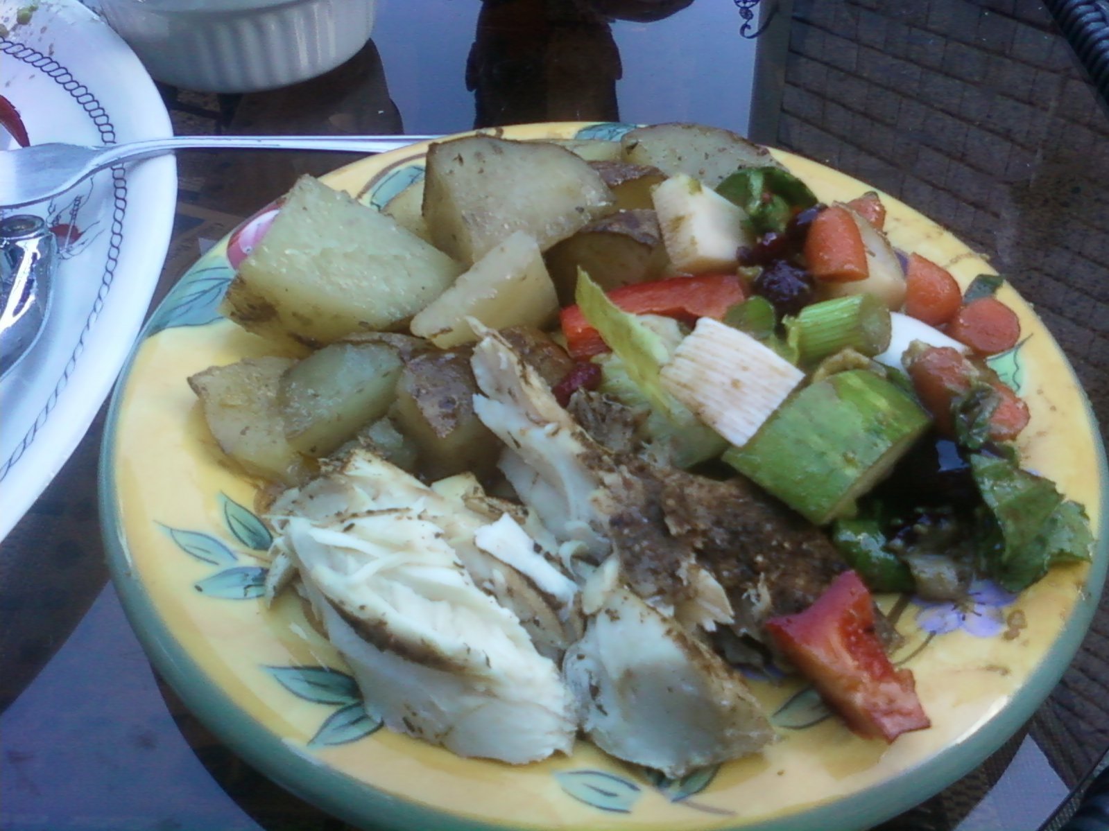 Got done and headed back to the folks house. Did some steamers for appetizers and then came the lobstah. Along with the lobster is a side salad, some pototoes, and broiled striper. Nice!! Or as they say around here "Wicked". |