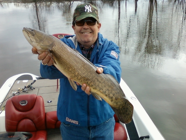 Did ya lip him????? That's a bowfin. Caught enough snakeheads by now to know the difference. Still a lot of fun to catch. And they do wreck baits. Biggest I've seen is 14lbs and biggest I've caught is around 6 lbs.