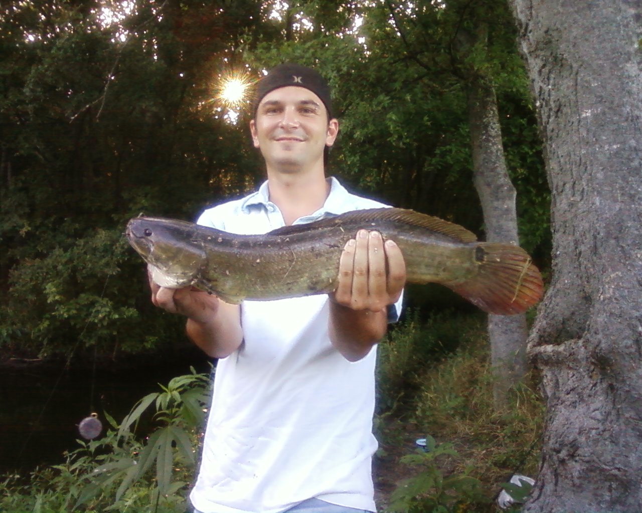 Was there a continuous fin along the bottom, Cotton? Or just normal fins like other fish? If it was one continuous fin, it's a snakehead. Otherwise, it's a bowfin. At first glance, I'd say Bowfin.