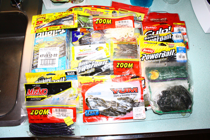 Plastics, Zoom, Berkley Powerbait & Gulp, Strike King 3X, Yum, Netcraft Plastic... colors ar all over the board. (Some new bags, and some have a few plastics used out of the bag)