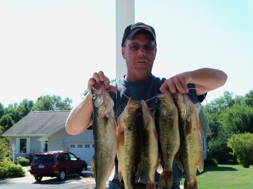 I just got back the other day from a week fishing on the upper mississippi with my 82 year old father and holly cow did we knock them dead... We did not catch to many walleye's this trip but that was ok because the smallmouth and largemouth made up for it. Most of the succuess was on a DT6 Olive green craw and one day it was a Strike King double willow leaf spinner bait.. At times it did not seem to really matter what you threw, they ate it... I have to tell you this as well because I do not think it's ever happened to me before but we pulled up on a wing damn and for about an hour in a half just about every cast you got a bass, well I made a cast and boom there's the hit, I set the hook and said it feels like a really good one this time, got it up to the boat and had a nice one on the front hook and another one on the back hook, double woo hoo, took the picture and threw back to the same spot and bam another hit, I had another double, by the time the smoke settled I bet we must of caught 25-30 bass a piece i lost track.. What a morning.... I do not normally keep bass and eat them but this time I did keep a few for the frying pan... These are just a few pictures of the trip...