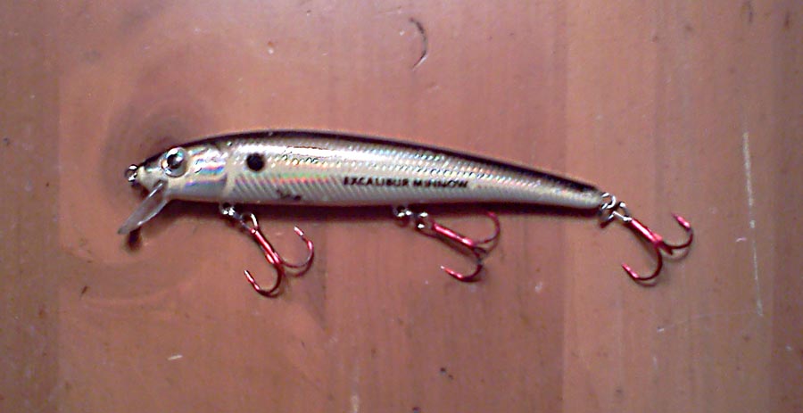 This is the lure I caught it on. An Excaliber minnow. I've caught several nice bass on this bait when the water is very cold. Right after ice out I caught 3 large bass from the same pier using this bait and lost a bass I estimated at 9 pounds just as I was reaching down to lip her. If I ever loose this lure I'm gonna cry, haha