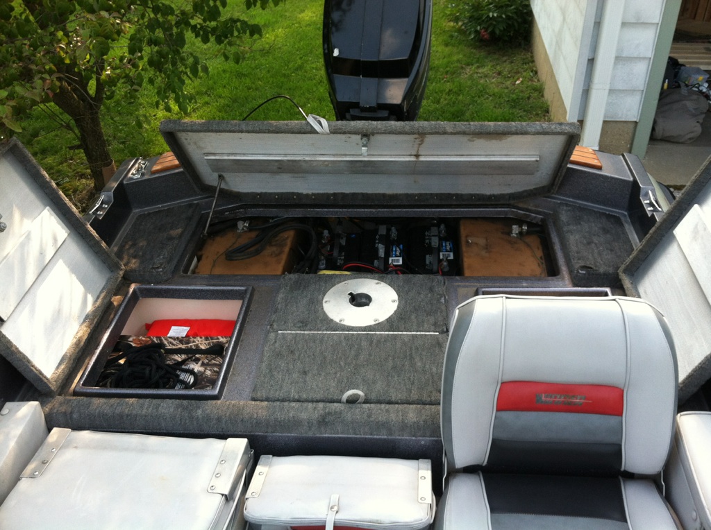 Well guys had some progress. As you can see the box is all done. I bolted the 2x4s to the boat, and that is one big lid for space underneath. The speakers are in and wired up.