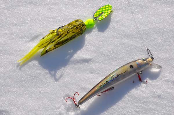 Here are a few pics from my outting last weekend. Had the motherboard on my comp not gone out last saturday, I would have posted them then. But here they are now. As you can see, there is still plenty of ice and snow here. But with some open water and cabin fever having set in a long time ago, I had to take a walk along the shore and make a few casts. You can see the one pic of the only two lures I took with me. They are ice out favorites of mine. The chatterbait was actually made here by bassboogieman here in the forums. Do you recognize it Bruce? It's my favorite chatterbait, and sadly to say I don't have it now. It became snagged on a log about 35 foot from shore, and there it still hangs.