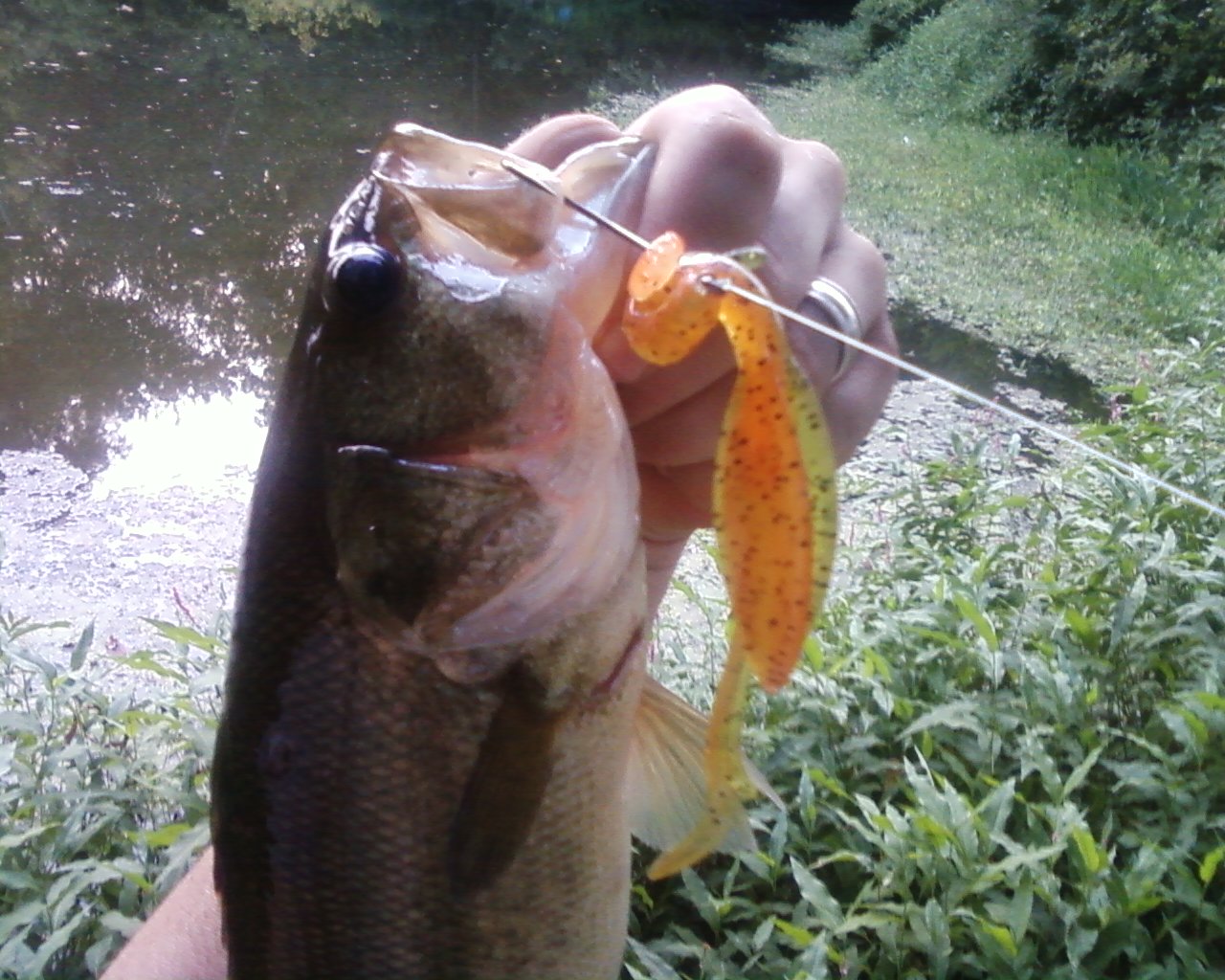 i eneded up taking em to the pond on tuesday....my actual objective that night was to work on my poppers....Ive been getting nothing on this pond the last few trips,and was losing faith in it.....well of course the popper's arent getting any action.....so i tied on one of your brush-hogs.....and on the 2nd cast i nailed this little guy,lol