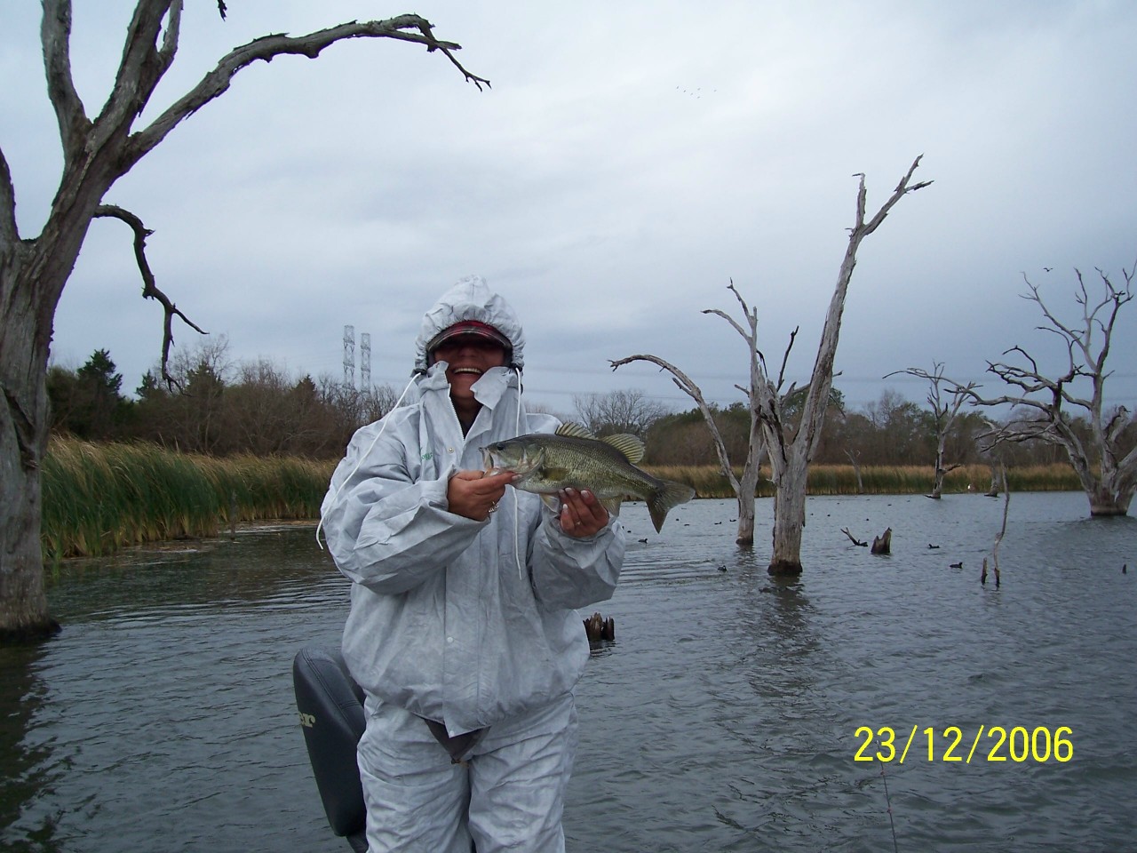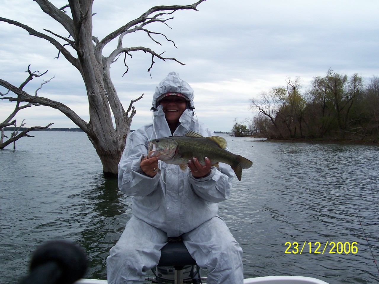 Bassintxlady and I went out Saturday and weather'd the weather for 3 nice winter bass. Of course we had to deal with the cold temps and then rain and of course, the worst of all, the wind factor. Bassintxlady landed the first one about 2 hours into our trip, and then pulled in another a short time later, she got the best of me again, Dang those show off side kicks..... I managed to lose my first one by getting my 8# test stuck in my trolling motor. My partner tells me it was a good one, I didn't see it, just the wake from where he/she jumped out of the water. There is one nice thing about being in the back of the boat when the wind is kicking up, you don't have to play with the trolling motor all the time while trying to fish. Anyone detect a hint of whine in there somewhere??? ![]() I lost another nice one I blieve shortly after catching my first one, due to the light weight I was using on my Trig. I couldn't feel the fish on my line soon enough due to the bow in my line from the wind factor. We caught all our bass fishing soft plastics Trigged, I was using the Vibracraw, and she was using a black floating worm, and a finesse purple curly tail worm. Hope everyone's holiday was a good one and have a safe and happy new year all. Bet Last edited by betursweetbass; 12-26-06 at 01:01 PM. Reason: To delete repetitiveness |