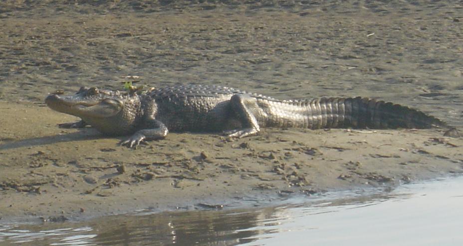 A gator sunning itself on a new beach, created by the receding waters.