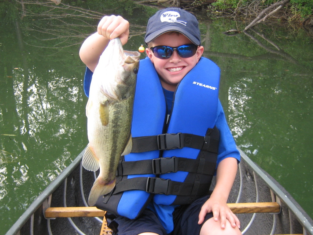 Got 4 hours of fishing in today with my son and my father. Not a great day to fish, really hot really early. I got shutout, lost a nice fish at the boat... Brushhog Jr. caught the only two bass of the day and they were pigs (for us). He did a great job of workong both fish. The first one jumped on him and the second one ran to timber. He played them both perfectly. Caught them on a Senko, Texas rigged weightless, two casts apart! The second one was actually longer and just as fat, Jr. just didn't turn it sideways!