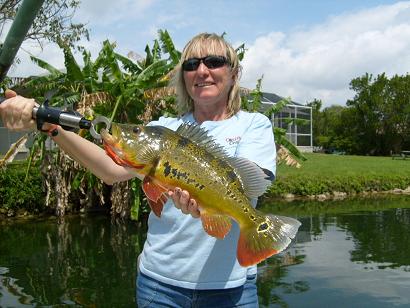 It's been great fishing for peacock bass in South Florida. We fished Miami today in the C-100 canal and boated 38 fish to 4 lbs. A 4 lb. peacock fights like 6 lb. smallmouth or bigger. They love hot weather and the more sun the shallower they come, quite a difference from the other bass species.