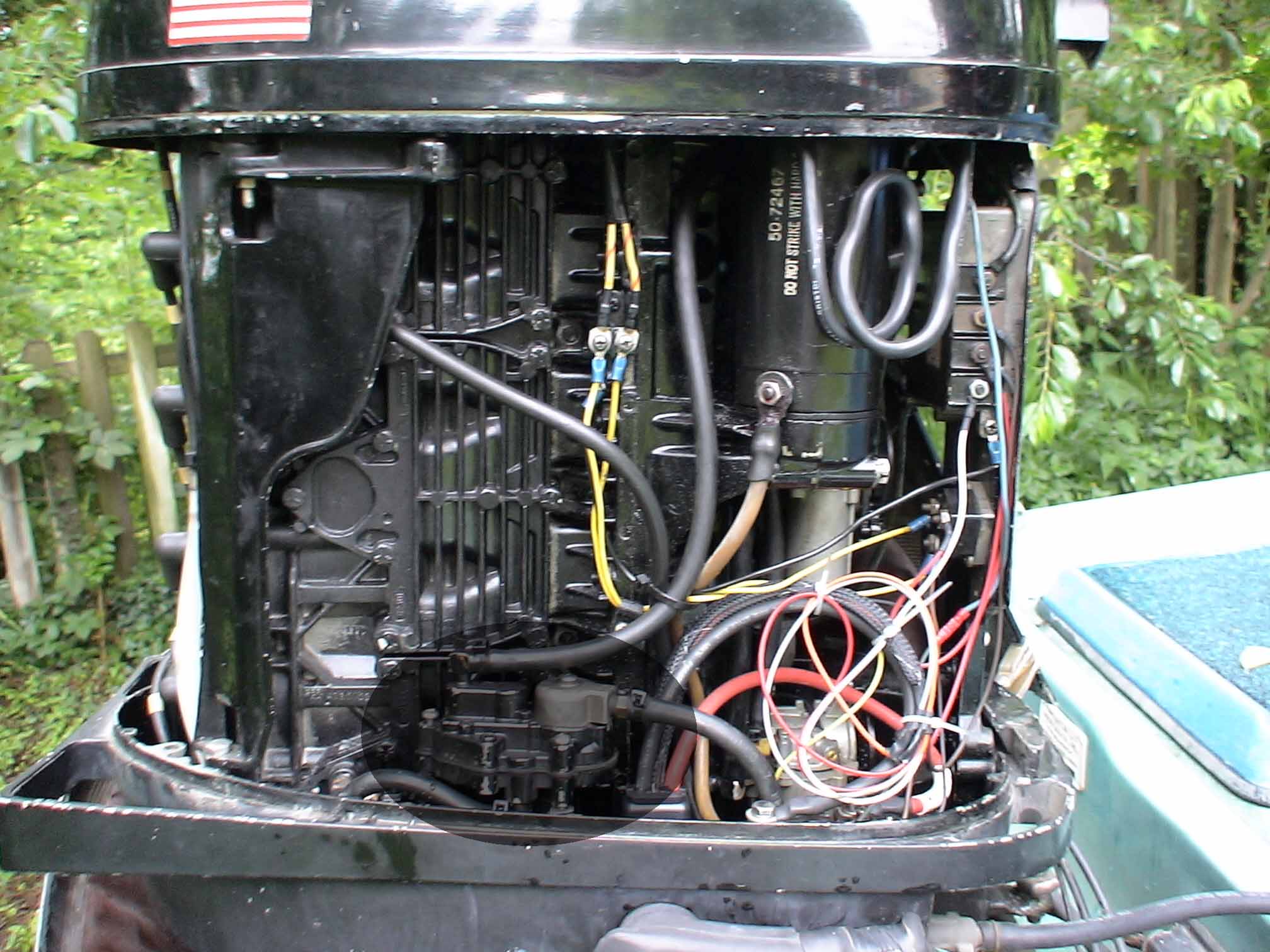 I am attaching two pics one of the right side of the motor as you look from behind the boat... what I think is the fuel filter is in the "gray" circle. the second picture is a close up...