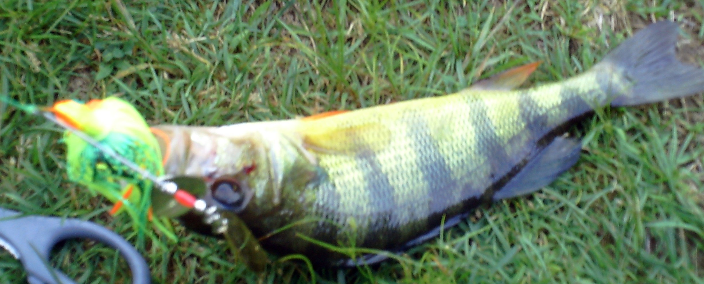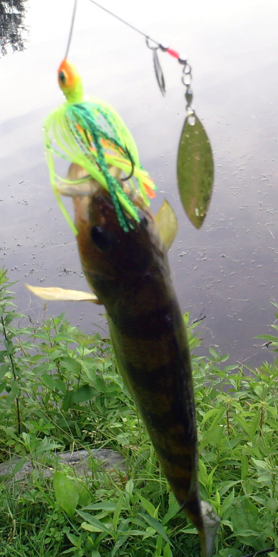 well had a fun but short trip with the kids tonight . they hooked a couple blue gills , and while i connected with a few bass i failed to land them oh well but i did have a perch nail my spinner which was a surprise to me but the kids loved seeing it . here are some pics . ... my other son was camera shy the one on the ground belonged to him .