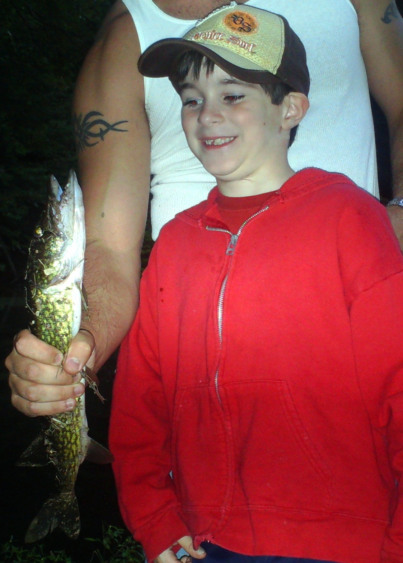 I took the boys out with my dad my brother and a friend for a few hours tonight . I didn't do well myself (only a dink ) but my 7 year old caught a good sized pickerel and so did my brother , my brother also caught three small bass all under 2lbs. The boys had a blast and it was the perfect way to cap off their first week of school . Nathan was pretty excited about the pickerel as it is the biggest fish he caught to date .