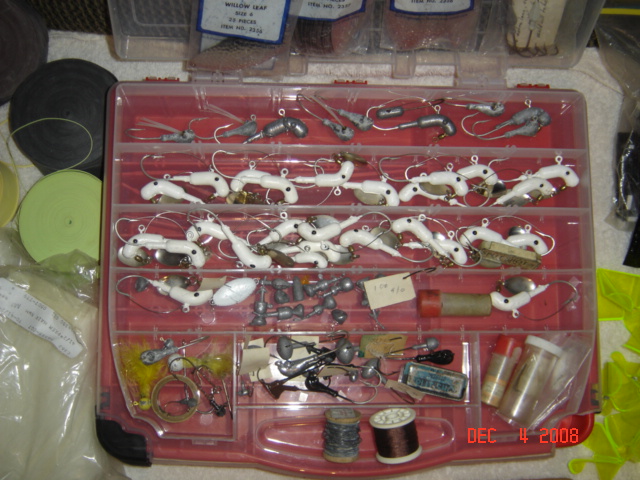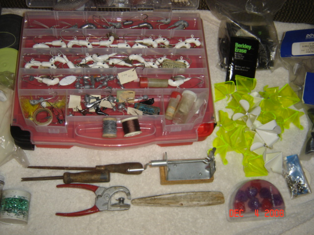 I am going to give everybody on here a chance to buy this lure making kit. I don't know much about any of it or what it is called but it came from my nephew. It has blades, White hair, wat to much to mention it also has the video and books to show you how to make them.Here is some pictures. I will ship if the buyer pays shipping if it don't sale in a few days I will put it on ebay. Lets here some offers.