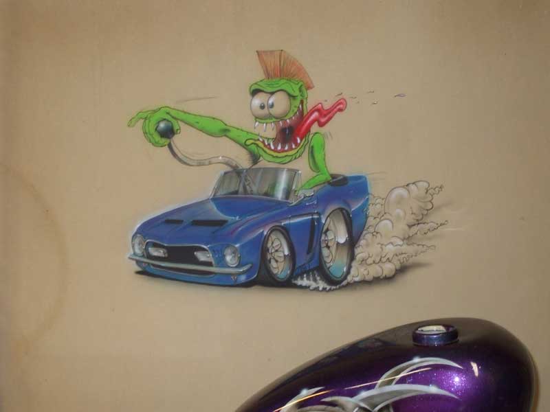 Thats cool....I like it.....I airbrushed a Ratfink character driving a hopped up Mustang on my shop wall one time as a demo for someone.....it survived the tornado bearly,so i'm thinking of cutting down that piece of sheetrock and making a picture out of it to hang up in the new shop....lol