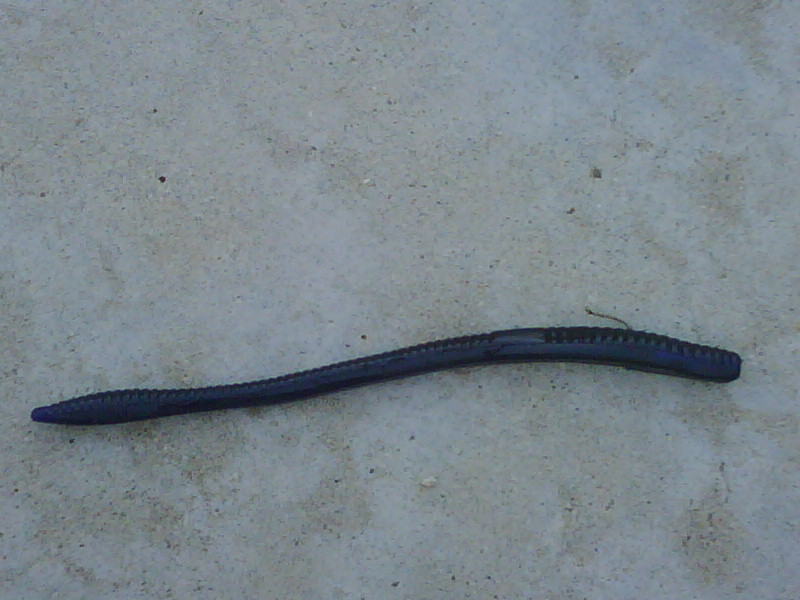 The rig is very easy to tie on and was deadly for me. It is really just a modified wacky rig. Take one of the longer (I was using 6 1/2 ") trickworms put a nailweight in the nose and wacky rig it half way between the nose and hump. It is best done with a circle hook since it is easier to bury back into the bait to be weightless. I played around with various retrieves and pretty much all of them worked for fish. I figured I would pass it on.