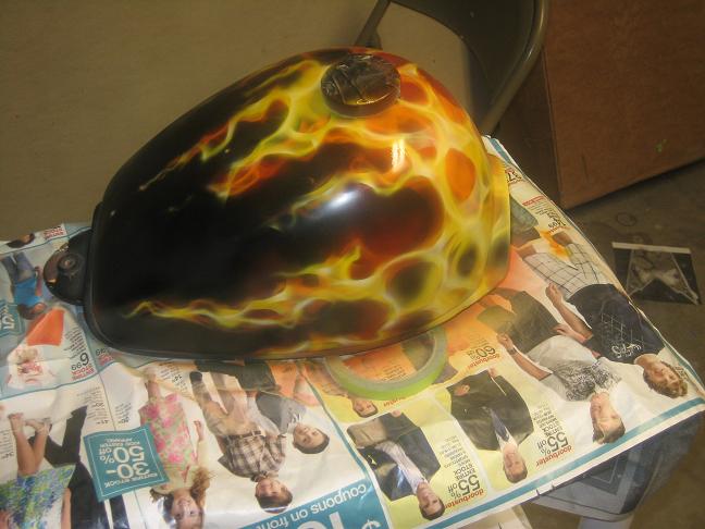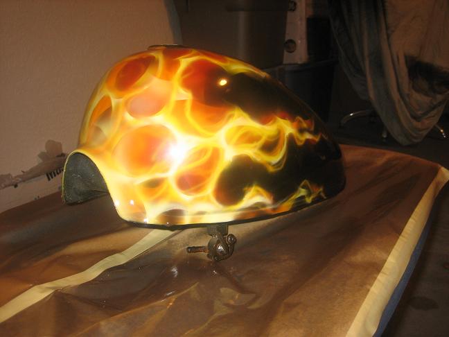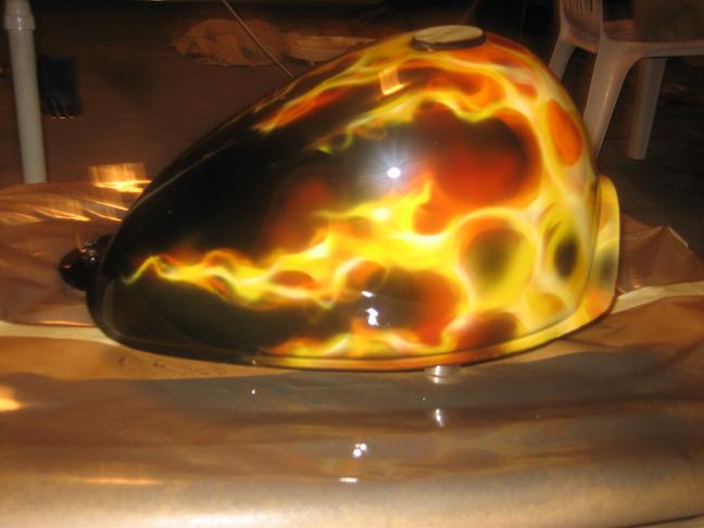 I was asked by a local Chopper shop to paint this mini tank so they could see what I can do......and they asked for true fire What ever, so here it is not cleared yet, but I finished airbrushing last night around 2:30am. Not my best true fire but once it's cleared, all the candies and pearls will pop like no tomarrow, you think it's bright now I'll get more pics when it's cleared along with a guitar I did for a client.
