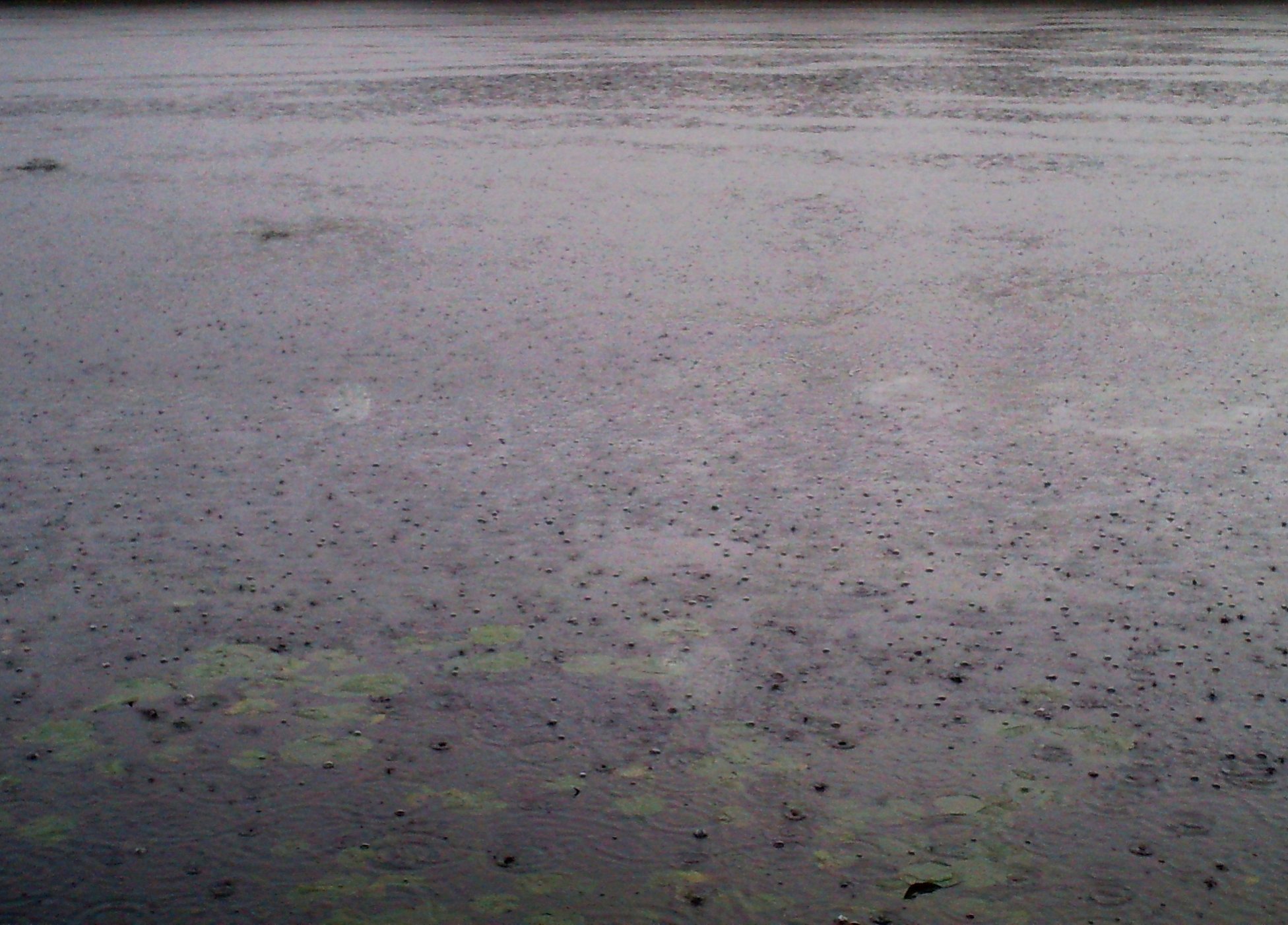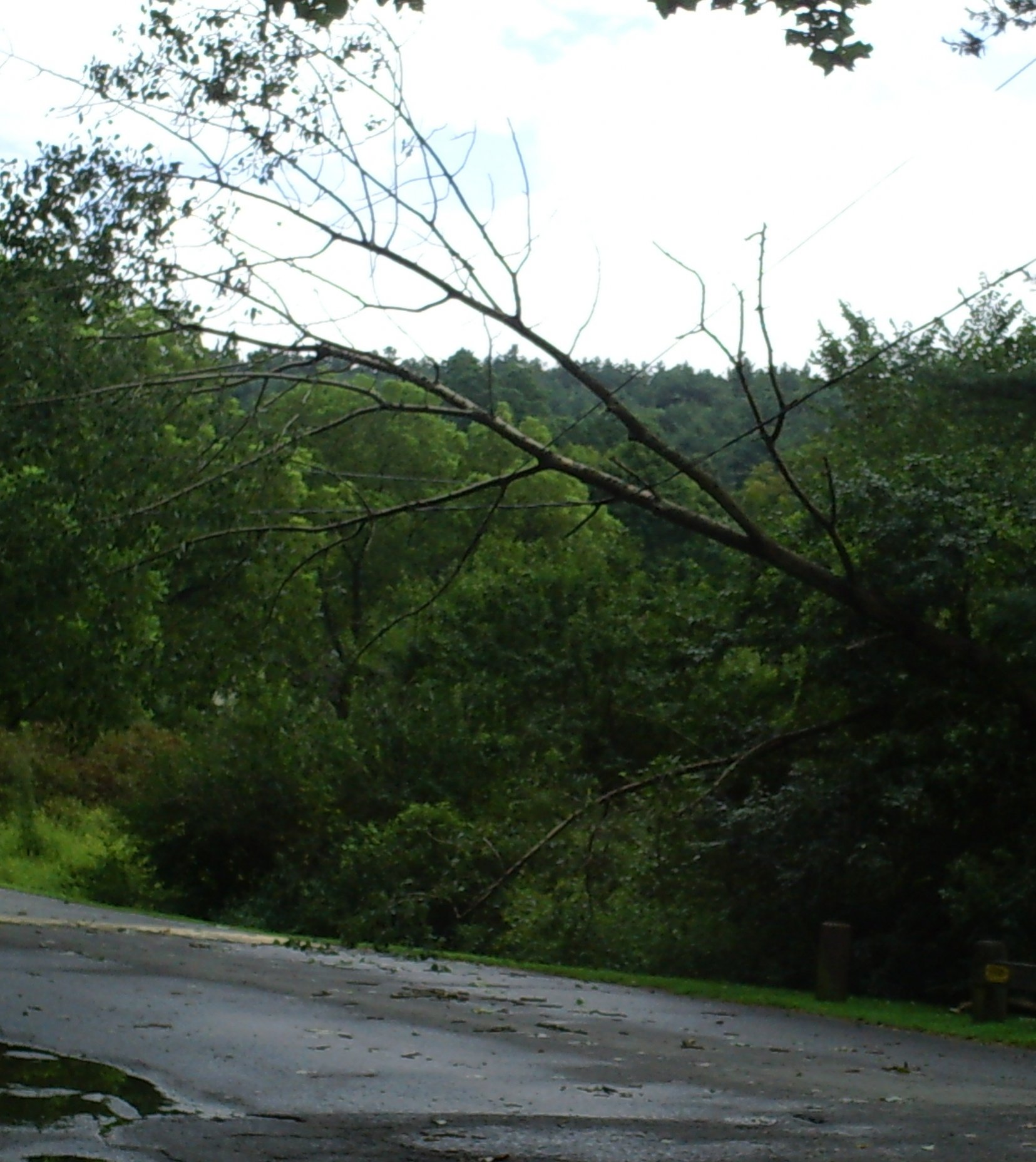 Well headed out a about 5:35 to pick up my brother for our normal saturday morning fishing trip never mind that it was pouring,thundering and lighting out still . When i got to his house he unfortunately was unable to leave as his girlfriend had to work and he had to watch his son . So I headed out by myself for a bit and while the fishing was tough while the rain was heavy it was still a good trip caught my first bass on a jig since just after the ice cleared this spring and caught a couple pickerel as well , also had a up close and personal moment with a few deer that just about gave me a heart attack as I was heading back to the car .Not to many pictures because well i was alone and hate taking the end of the arm shots . The first picture is how hard it was raining when I got to the lake . and the last is a tree that the storm brought down while I was fishing .
