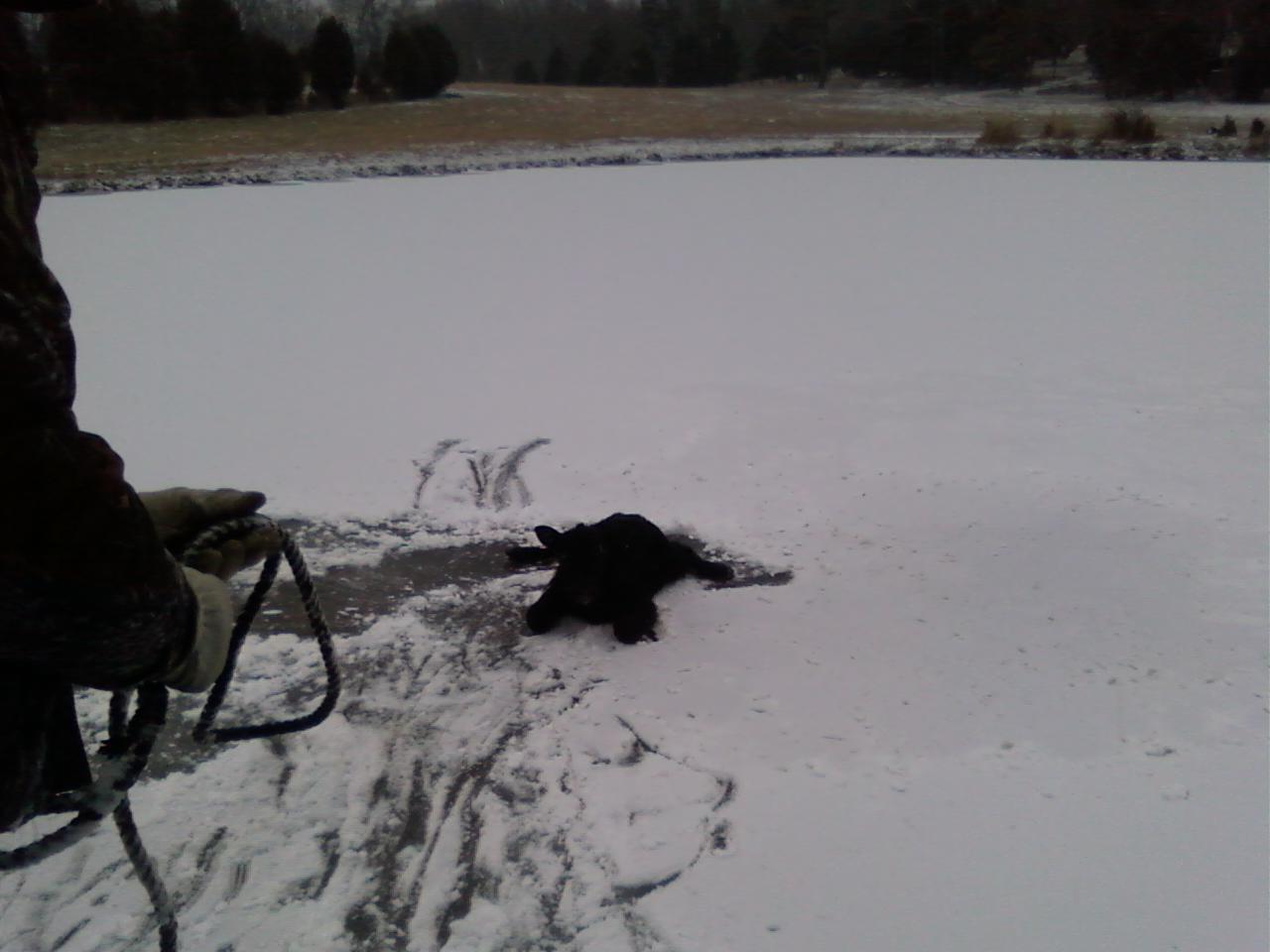 The calf would have been fine if not for it's excessive kicking, he fractured the ice and went through. After the calf decided to go through the ice I had about 20 seconds to decide that it was inevitable, I had to go in after it. The water at that part of the pond was a frigid 4 foot. About 2 feet further out there is a 3 foot drop which would have probably killed the calf (because I was not going over my head). Currently the little guy is dry and sucking teet. Also I am still trying to regain feeling from my chest down.