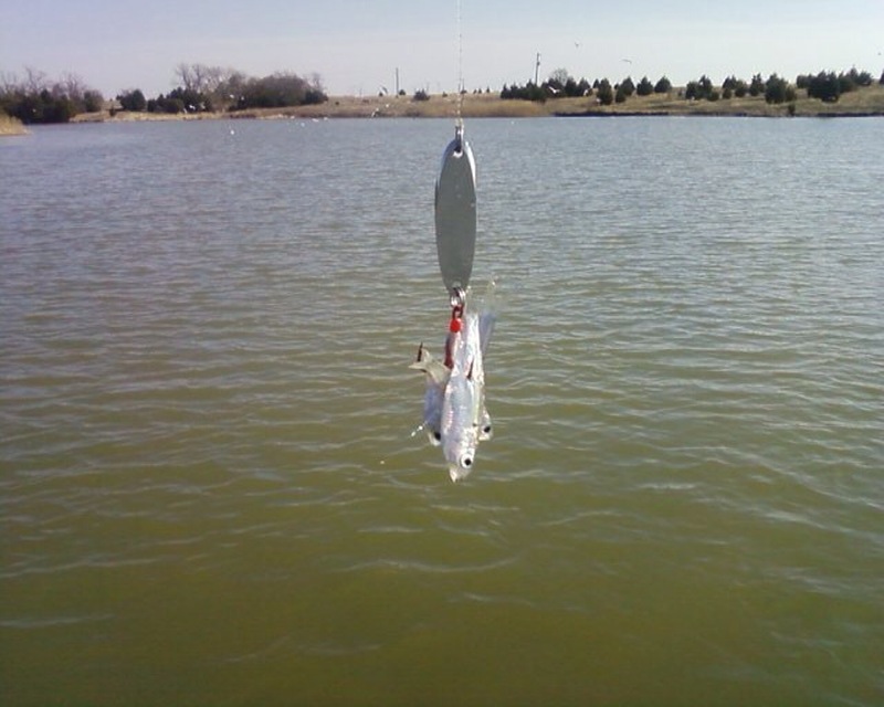 The picture of the spoon was my Dad's lure..It hooked three of them on a single treble!!!...You can vaguely see some of the seagulls going crazy in the background on that pic..Thats where we started and drifted that far away and were still hooking them...