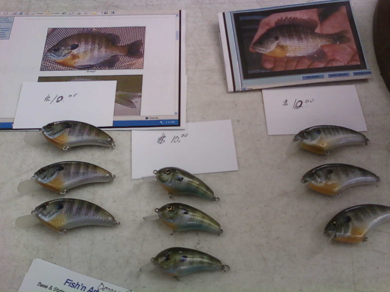 I've posted a few times about a guy I use to custom paint crankbaits and I wanted to post a couple pics of his latest work. He also does replicas and I think he does a pretty good job. He was at the latest flea market and I took a couple pics. Check out the bluegill crankbaits and enjoy the artwork.