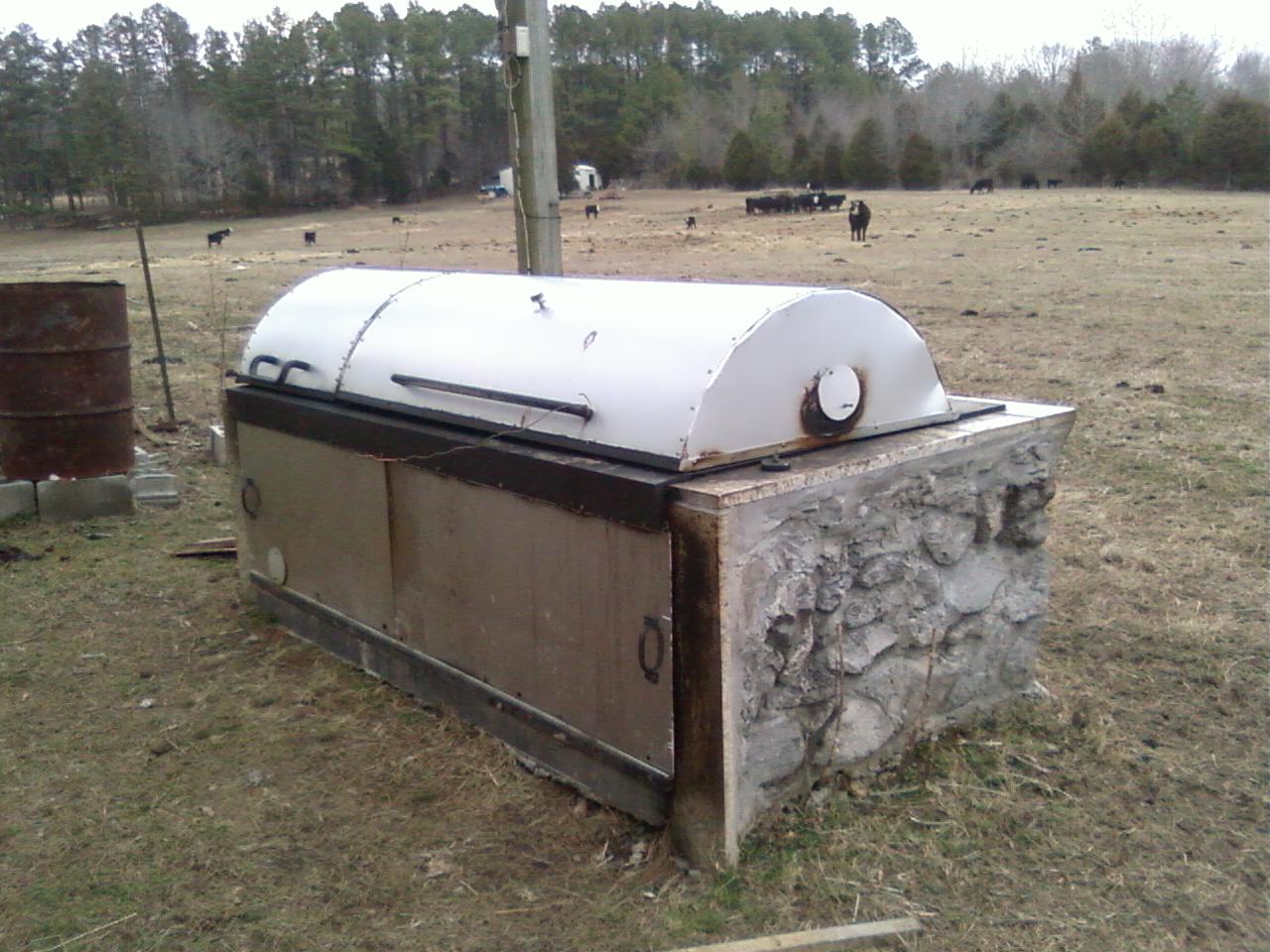 As you can see it's seen some use. We rebuilt it last summer as a sort of pet project, but I think it turned out great. Holds temperature like a champ. Notice my dads sort of unique touch to the frame(goes along with his business). Whadaya think? Sorry if the pictures are a little blurry. I took them with my phone while I was tearing out a fence row directly behind the pit. Pay no mind to the beasts in the background. (more trouble than their worth) BTW: If anyone can get these pics to Zooker, do so. I'm eager to hear his opinion of this setup. Plus the pics should put him in high spirits.
