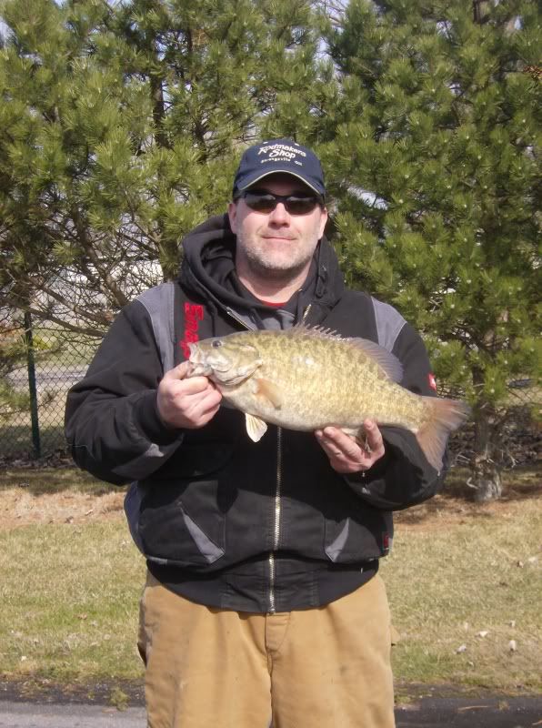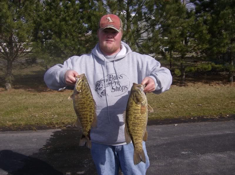 We ended up running about 20 miles on Erie this morning in 3 and 4 footers. Took us a little over an hour to get there, and an hour to get back. I had 4 smallmouth that weighed a hair under 16 pounds. Biggest was about 4 lbs. 13 oz. Caught 2 on a Strike King Green Pumpkin Coffee Tube with a 3/8 tube head, and the other on a dropshot rig w/ a Strike King 4" Finesse Worm in Green Pumpkin. The best of all is I am on top of points and weight for AOY and Mr. Bass! (My 2 big smallmouth) ![]() (My boaters big 5.72 smallmouth) ![]() Ryan