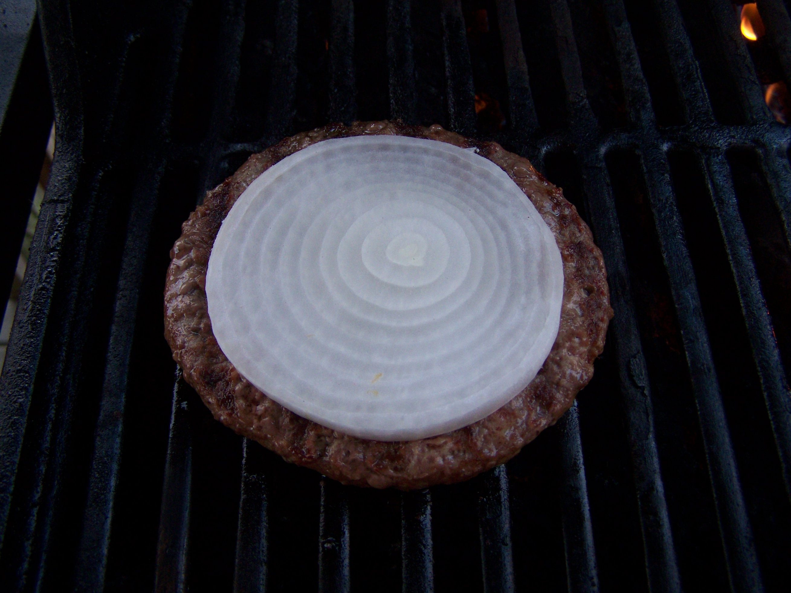 Flip, add crosscut section of Red Onion, grill for 4 minutes