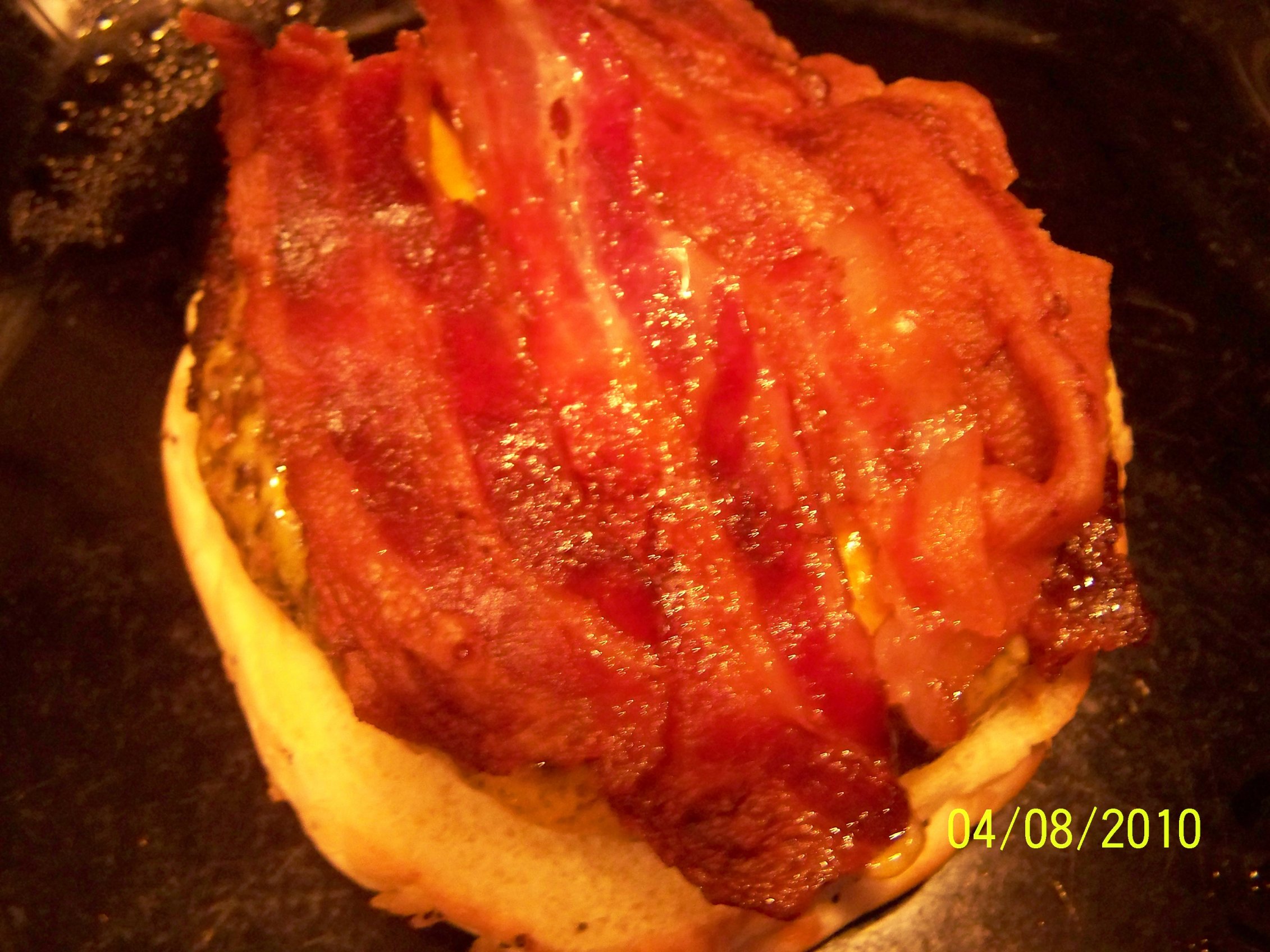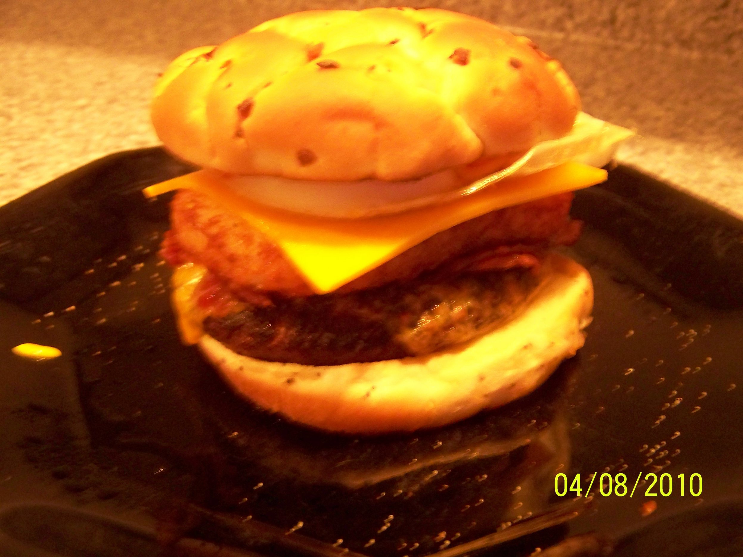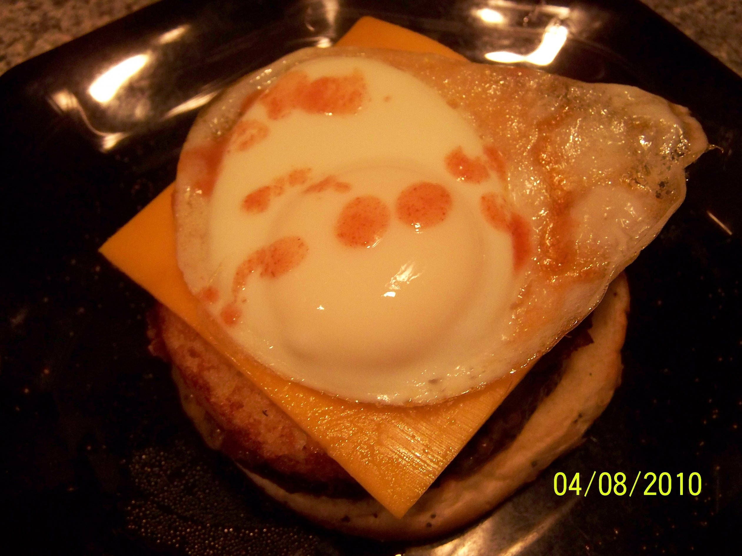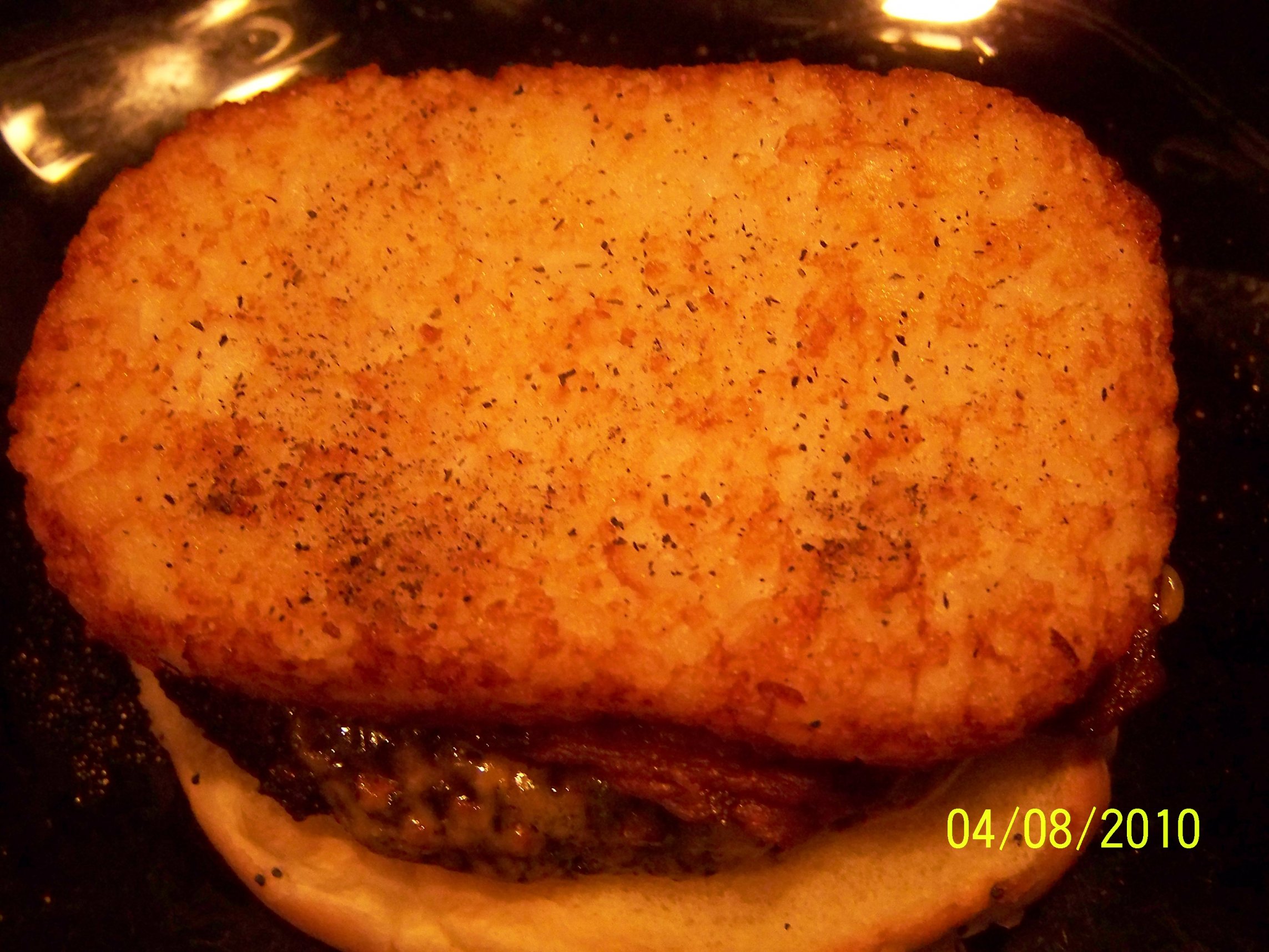 Took me a few days to get around to it, but better late than never, my probation officer used to say. ![]() Most won't need a play by play, but just in case someone does, here goes. 1- Heat oven to 400 degrees. Once heated, turn the grill on high and throw the bacon in the oven for 15 minutes. 2- When 15 minutes are up, throw burger pattie on the grill and a hash brown pattie in the oven. Set timer for 5. 3- When 5 minutes are up, flip hash brown and burger patties. Remove bacon from oven to drain on paper towels. Crack egg into frying pan. Set timer for 4 minutes. 4- When 4 minutes are up, add sharp cheddar to burger pattie and season egg with Frank's Red Hot Chile 'n Lime. Cook everything 1 more minute. When time's up, remove all ingredients from heat. Place burger on onion bun Add bacon. Add hash brown pattie and season with salt and pepper. Add another slice of sharp cheddar. Add egg. Top with mustard. Loosen pants and take a nap