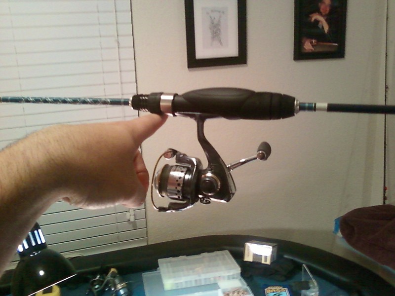 It's a 5'6'' Lite/Fast CRB ''Blue'' blank paired with the blue ultra lite President reel. It features the American Tackle Halide guides,Aero reel seat (god I love this seat!!), Batson winding checks and EVA super firm grips. I used the Fuji concept guide spacing system on this.(a process of measuring your spool diameter to determine the ''choker'' guide placement....or middle guide,basically...Its different for sure..However,I really like the system for spinning rods,..It cast great!! I also,after talking with Jrob, used the forhan locking wraps on the guides...Another technique used to lock the thread down so guides dont pop out if they catch on something...boat locker,etc. All in all a fun build,I rushed the epoxy a touch,but Im happy with the results. Im very happy with the blue blank,blue reel,and thread all matching up....Its a very beautiful rod if I say so myself ![]() I also got this rod damn near perfect balance!