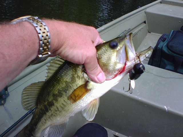 Got out today and had what I believe was my best day ever as far as numbers of bass caught. I ended up landing 34 bass, and another 6 or so shook off. Wild action for sure. All but one were caught on a Heddon Baby Torpedo which is one of my favorite lures for this lake. Worms, cranks, spinnerbaits, you name it, nothing would draw a strike today except for this Baby Torpedo. Had a couple guys in a bassboat come by to ask what I was doing as no one was catching anything. I told them what and how, but they didn't have a Baby Torpedo. Yeah, me in my jonboat, I had a twisted sense of "OH YEAH". haha The secret to todays catch was how the Torpedo was worked. You had to barely twitch it, just enought to get the blade to spin. Short twitch twitch pause, and you caught fish. Increase the action and nothing. Conditions were very overcast and calm. When the wind picked up the bite died. As soon as you had glass conditions, they attacked the Torpedo. Attacked is not really correct. They sorta just sluped it in. You really had to watch to see the lure dissapear under the water. Cast it out near shore near any cover and you were in buisness. Especially over the tops of submerged grassbeds with brush nearby. The largest bass pictured I estimate at around 5 pounds. The smaller one was number 34. I might add, I did catch a bluegill that was full of attitude. How it got that 4/0 hook in it's mouth is beyond me.